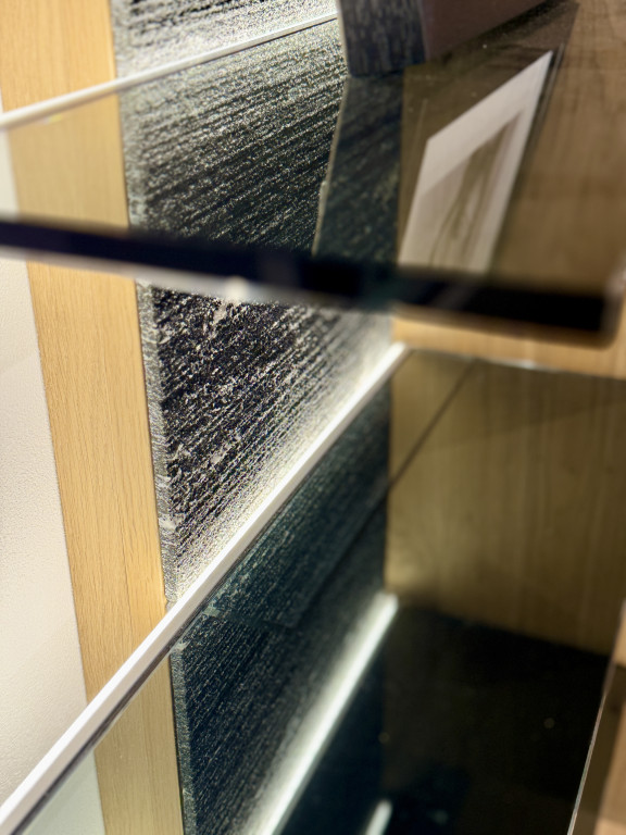 In der Vitrine ist das mittlere Einlege-Glas an der Kante leicht angeschrapt, wie auf dem letzten Bild zu sehen.
